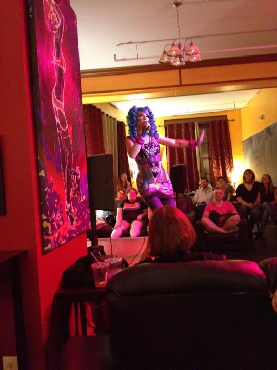 Saturday night – Kacie, Lachelle, and I took Teresa to her first drag show at Shameless Grounds in Soulard. The show was hosted by and featured the first drag queen I’d ever seen (Siren). I thought Siren’s eccentric and somewhat outlandish ways would be good first-time viewing for Teresa – little did we know, Pinko, another performer would be hot on Siren’s heels as a show-stealer, though Siren threw out some great comedy that kept us all laughing! I was branded by the barista as a “double fister” when Teresa ordered me a Caramel Macchiato and Kacie ordered me a White Chocolate Screamer (vanilla shake with white chocolate syrup) – happy birthday to me, happy birthday to me… drink for each hand!