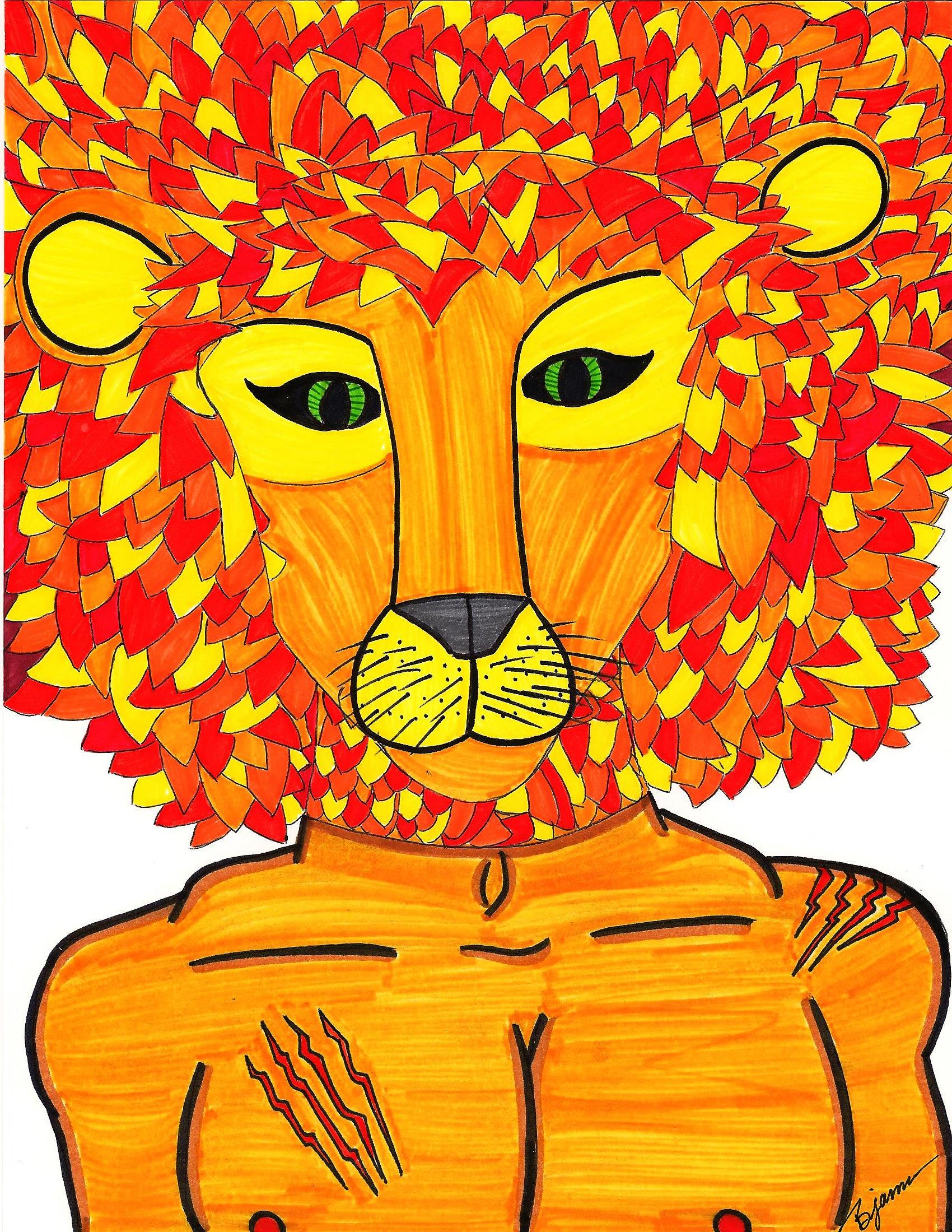 Last year, after seeing David Wolk’s Charm Ape Exhibit, I was inspired to create the “Kingdom Mask” series (see Art of 2013) – a series of human bodies/forms with animal heads (“masks”). I now present to you, the newest addition to the series, titled Lion. Inspired in part by the “Charm Ape” (baboon) I created last year, and in part by the song/sequence “I Just Can’t Wait to Be King” featuring Simba from The Lion King, I let my imagination soar. Here is: