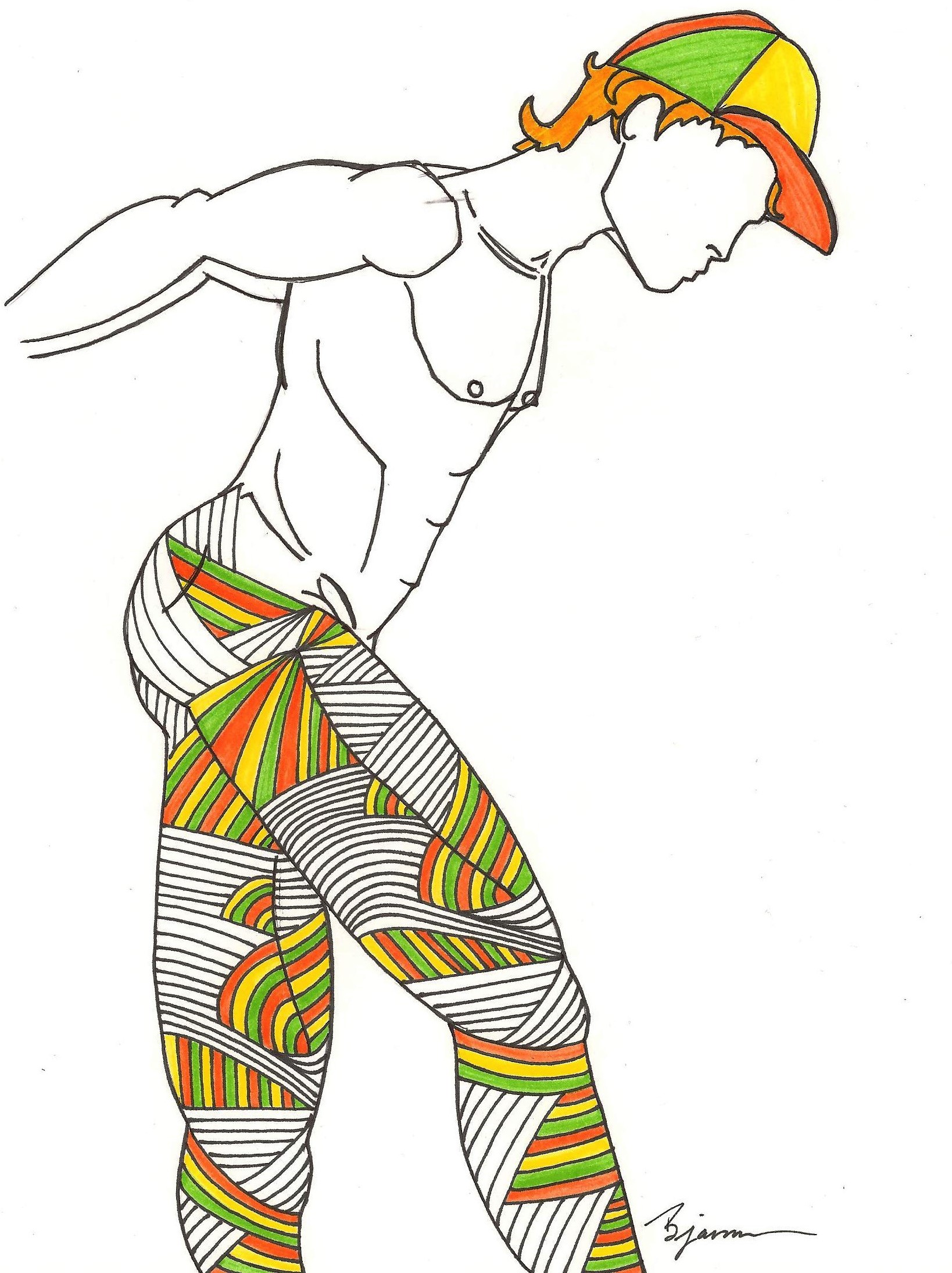 Now, it’s time to shift gears just a tad. About a week and a half ago I began a piece for my “Faceless Man” Series titled Skater Boy. The piece is designed to be patterend and homoerotic – using the colors of spring and summer (does it feel a little Jamaican to you? That’s ok. Me too). I’m always interested in using the idea of a 3D figure and flattening it to suit my need as a 2D artist (generally). I’m also not concerned with proportions when it comes to drawing human forms – I design and present what I feel looks right for the image I’m creating – being anatomically correct sometimes takes away from that “wonder.” So here he is:
