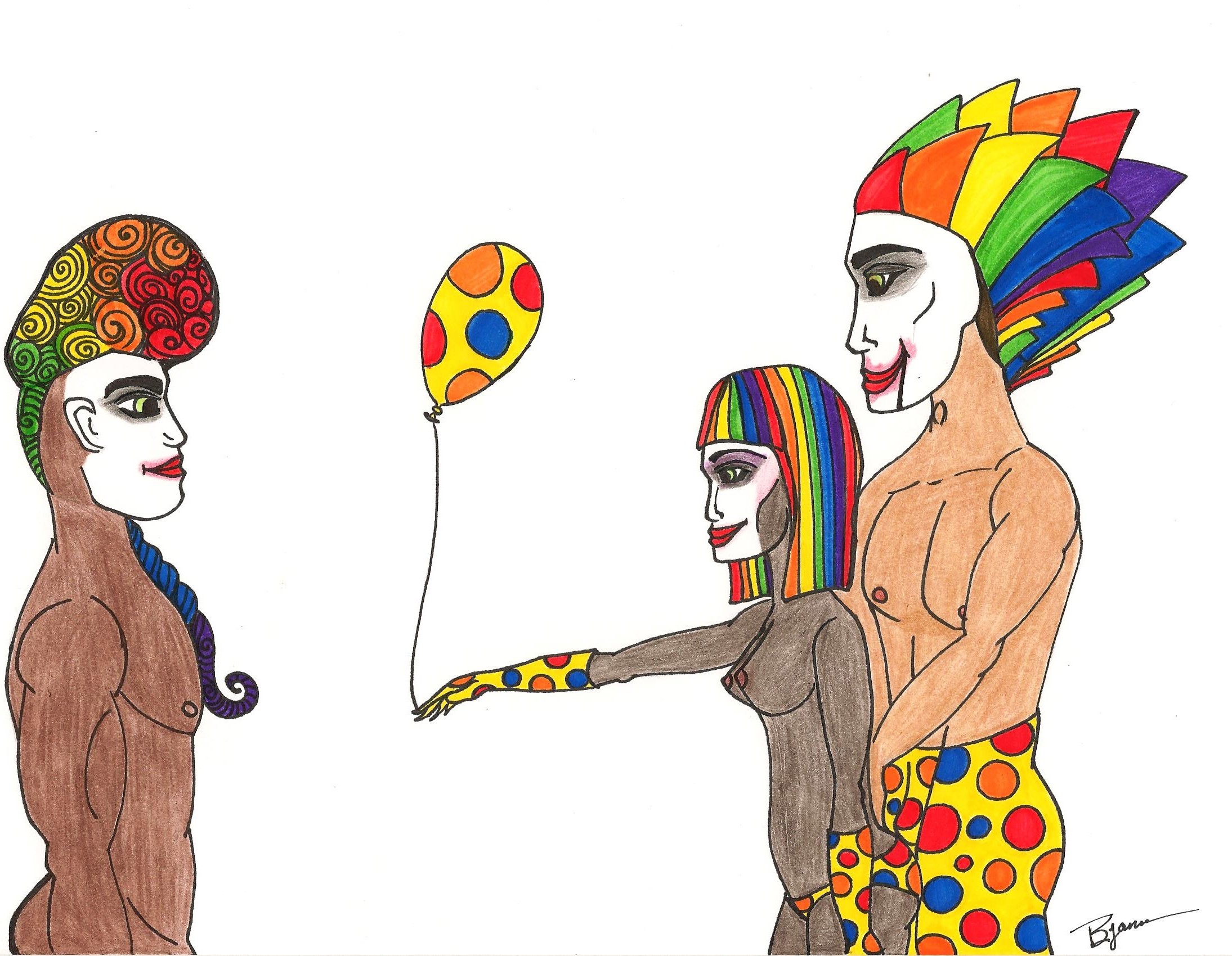 Thirdly, I present The Recruitment. For this piece, I have a white man and black woman (the circus power couple) recruiting a new clown to the circus. Her offer is a balloon, his offer is her. Controversial? Maybe, maybe not – that depends on your reaction. Will he or won’t he accept the offers and join this group? Is the circus all he’s being recruited for? Here I decided to play a bit more with hair – and the concept of hats and wigs. The black male clown features a wig I created separately and applied to the picture later. I present: