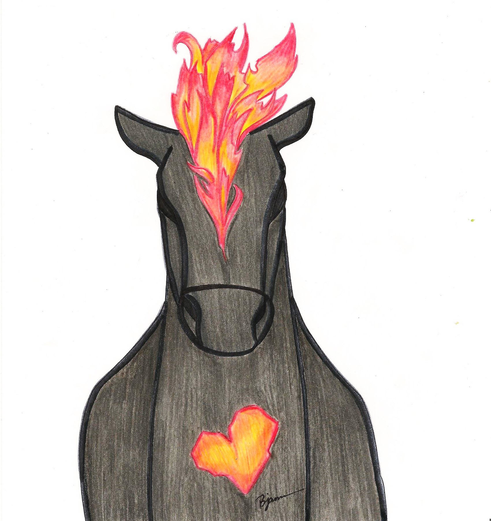 Burning Desire features a black horse with a mane of fire and a burning heart. The horse itself is a symbol of power, beauty and strength. Its color represents the unknown – mystery, wildness, night and death. The fire (and its color) is representative of illumination and destruction – symbolic of the old passing and the entrance of something new.