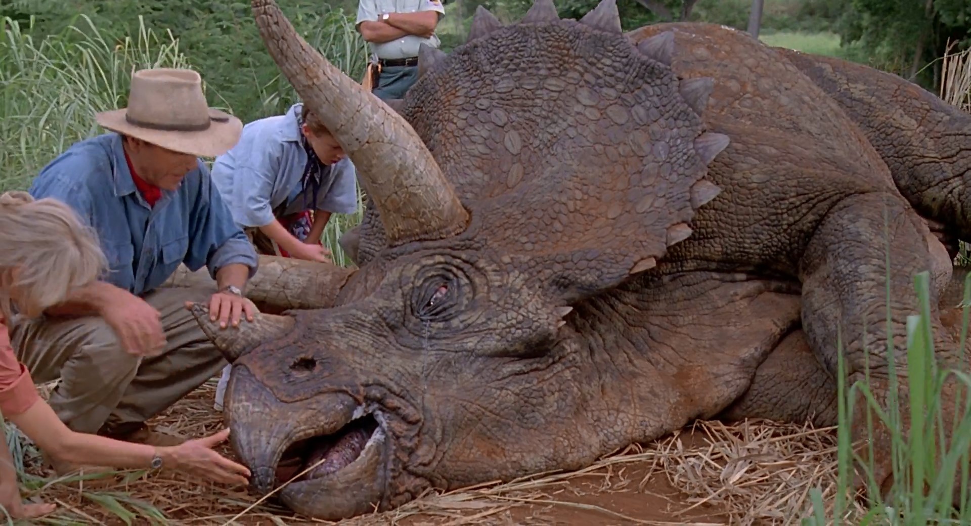 Another iconic feature in terms of dinosaurs, Triceratops makes her first appearance in Jurassic Park. She plays a key role when Dr. Grant and Dr. Sattler (Laura Dern) discover she’s ill. Dr. Sattler stays behind with chief veterinarian Dr. Gerry Harding (Gerald R. Molen) as a hurricane approaches. Anxious to discover the cause of the “Trike’s” ailment, Dr. Sattler is removed from the subsequent Tyrannosaurus situation! Whew!
